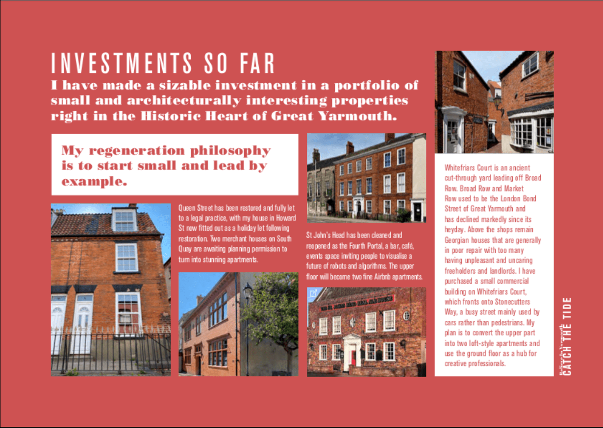 Gillian Harwood owns the site of Fourth Portal B and is investing in restoring buildings in the town of Great Yarmouth to a high standard, recovering their architectural richness. This manifesto has been a joint effort to encourage other like-minded people to potentially invest to create a blueprint for collaboration and commerce in a post-Covid-19 world full of challenges.