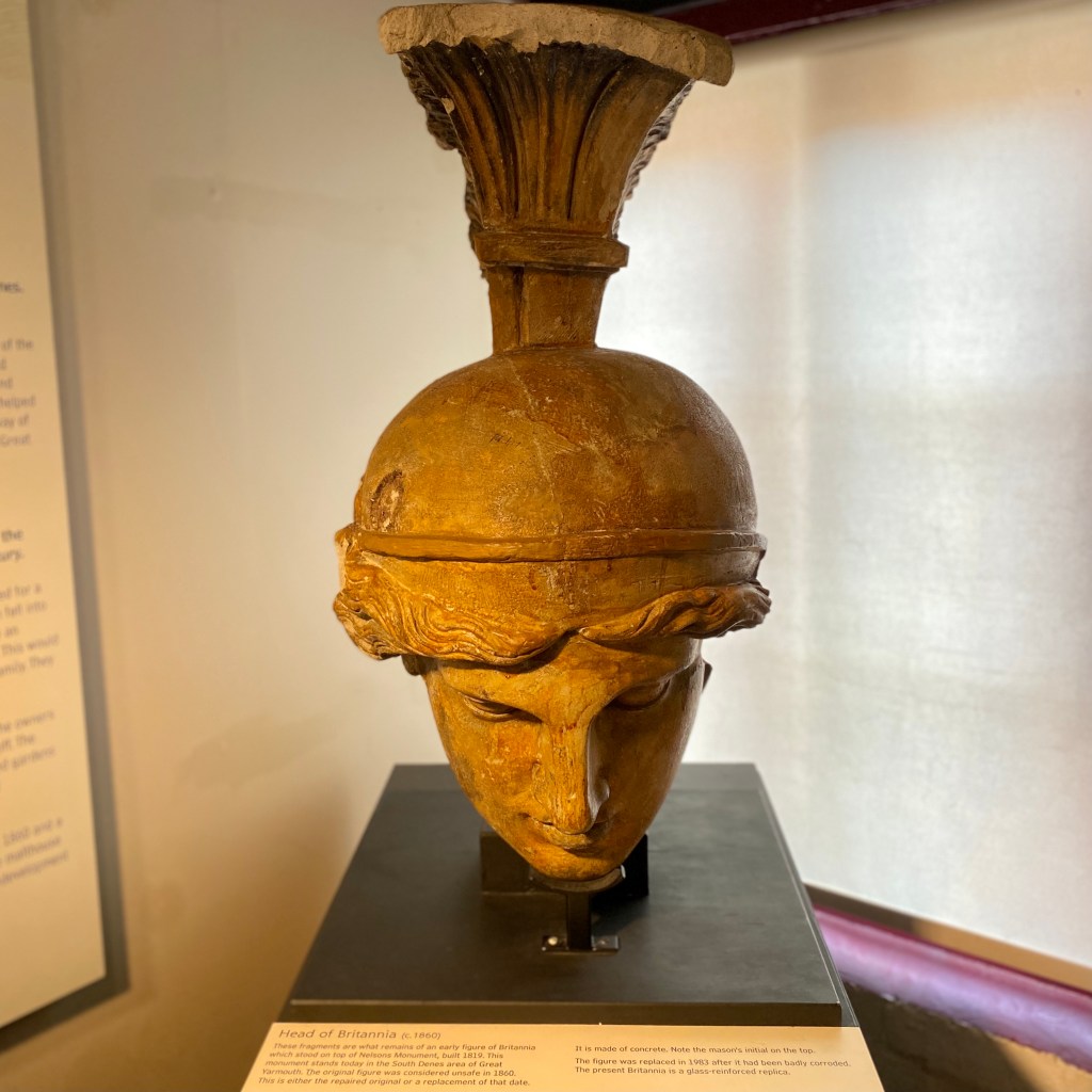 Left to Right: Head of Britannia (concrete, around 1850), Glass herring sculpture, Excellent series of stories of people from overseas who moved to Great Yarmouth