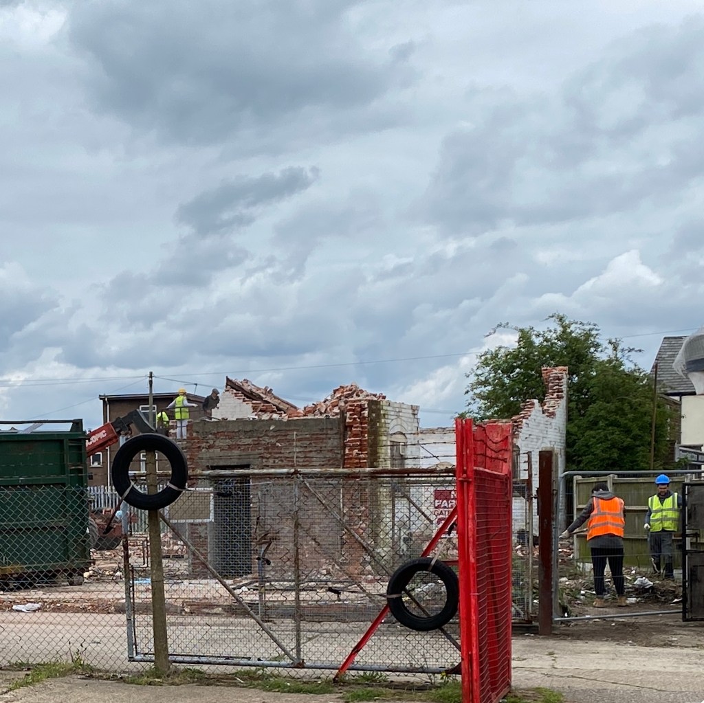 L to R: Great Yarmouth Aldi refit (summer 2021), Man in flat cap and worker with trainers on demolition site on North Quay, Great Yarmouth (May 2021), Market square roof construction, Great Yarmouth council led project (September 2021), block paving and restoration, Cromer (September 2021).